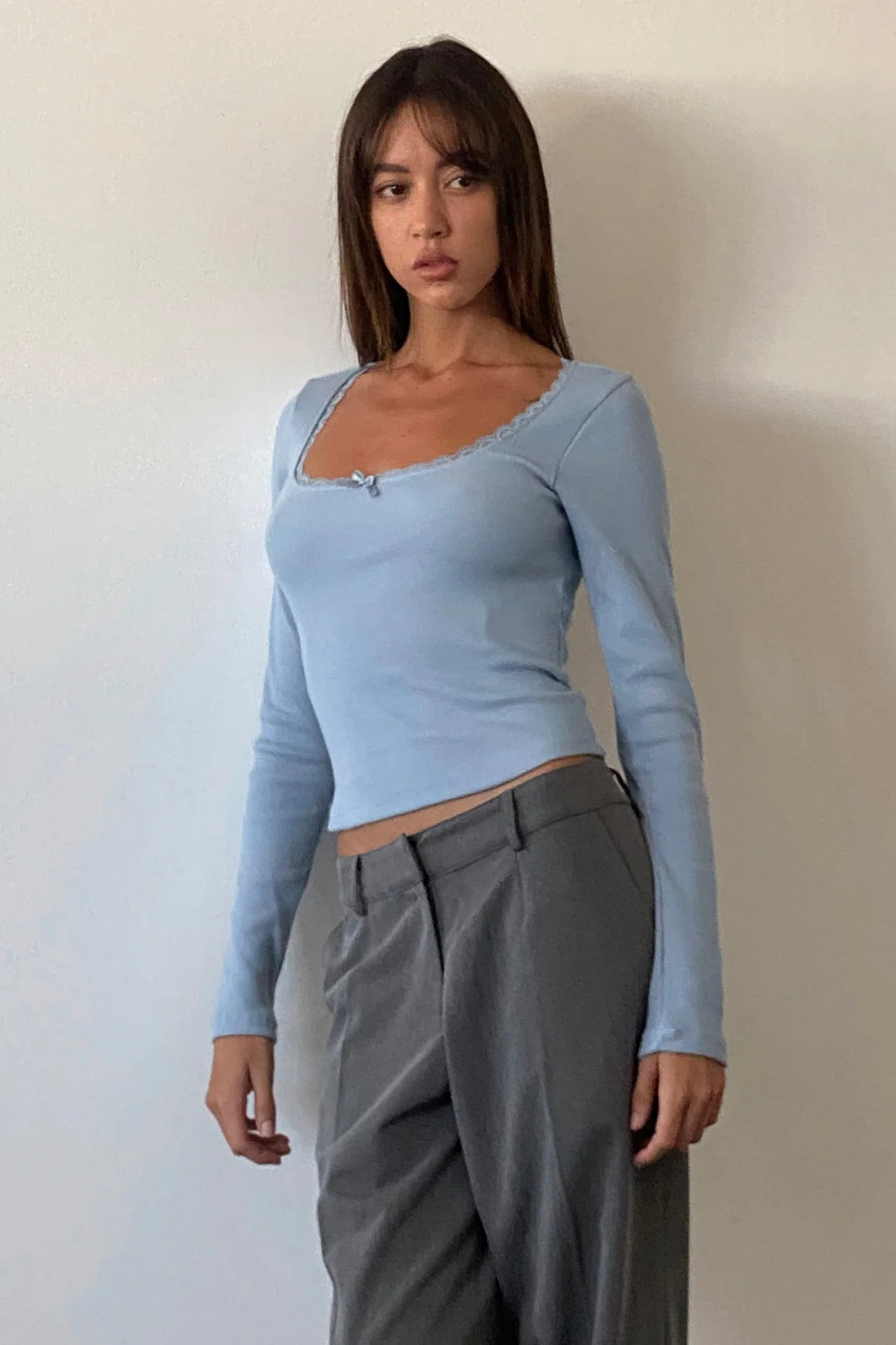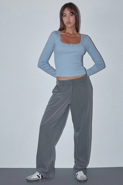 This long-sleeved favorite features a lace trim at the neckline and a tone-on-tone bow at the center front. Complete the look with our low-rise jeans.