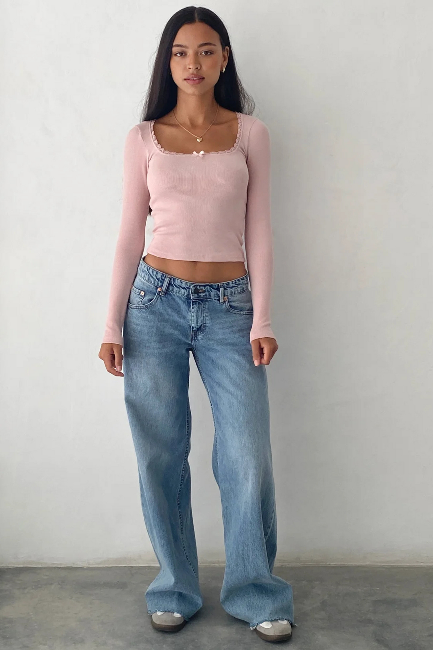 This long-sleeved favorite features a lace trim at the neckline and a tone-on-tone bow at the center front. Complete the look with our low-rise jeans.